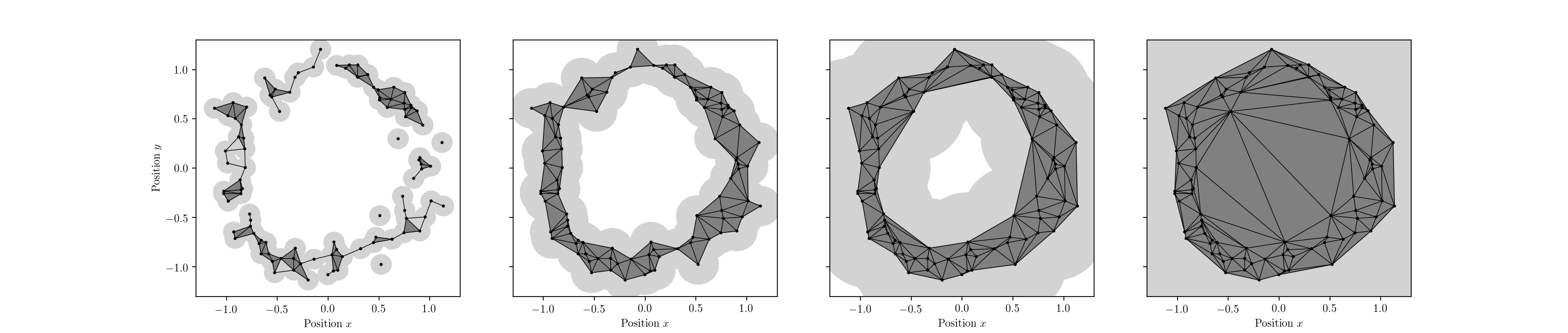 Typically, topological features such as multiple connected components, loops or enclosed voids arise in the complexes of interest, as can be observed already in our example: Upon increasing the radius r topological features may arise in the complex, which at a higher radius get closed again by higher-dimensional simplices appearing in the complex, cf. the linked Figure. The smallest radius of the former type is called the birth radius r_b of a topological feature, the highest of the latter type its death radius r_d. In general, topological features may be classified by their persistence, i.e. their birth and death radii. The mathematical construction to accomplish this is persistent homology: Given a nested sequence of complexes, over which range in the sequence do topological features (so-called homology classes) exist?