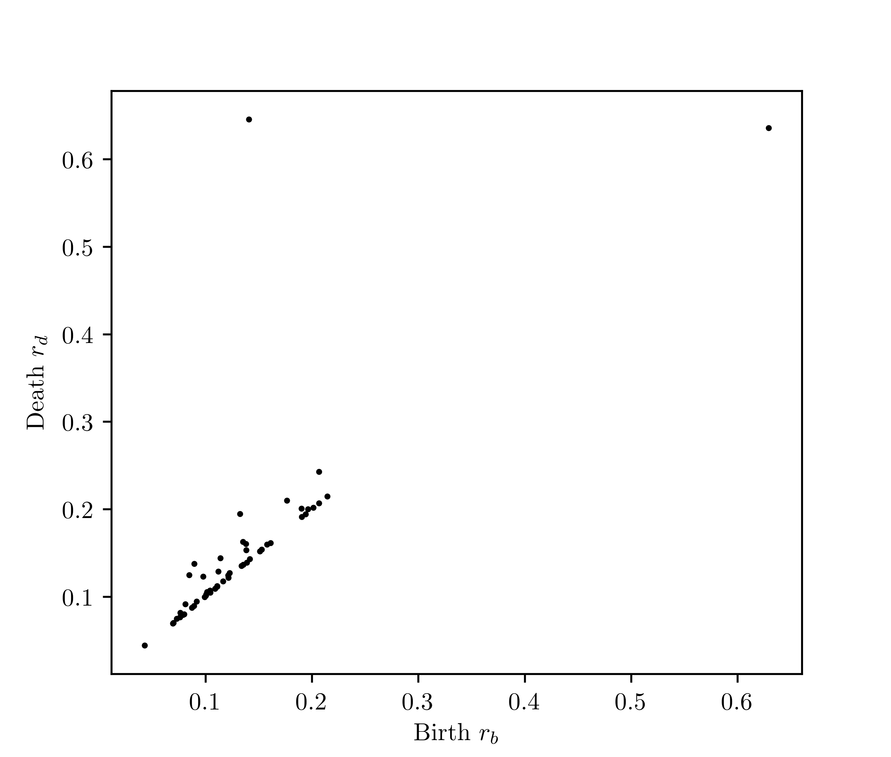 Using persistent homology, it is possible to describe how dominant topological features are in the point cloud of interest. Features that persist over a long range of radii dominate the overall appearance of the point cloud, while features with a small persistence typically appear as noise on the overall shape of the point cloud. In the linked Figure the persistence diagram of the example alpha shapes is given. Displayed in the bottom-left corner of the diagram, quite some homology classes are born at small radii and die at comparably small radii again. This can be interpreted as reflecting the noise added to the circular data. One homology class in the upper-right corner gets born at a large radius, but dies again immediately. However, there is one homology class that is born early, r_b\approx 0.15, and dies late at around r_d\approx 0.65. This homology class represents the circular structure immanent to the point cloud.