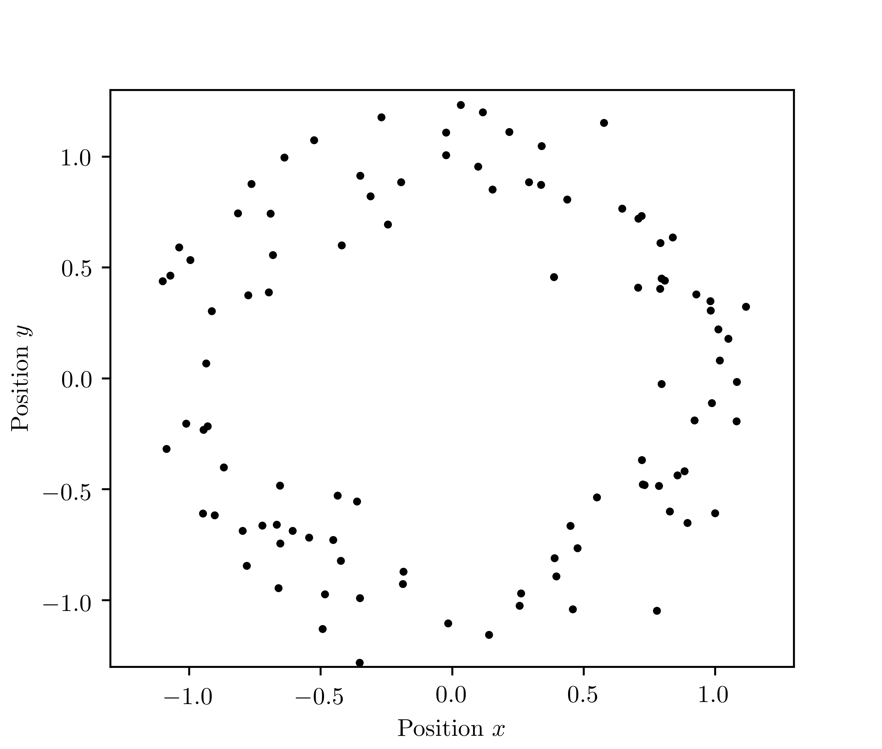 The point cloud that we use to catch a glimpse of the topological data analysis machinery is the one displayed in the linked Figure: Data points lying on an approximately circular shape in two-dimensional space, though somewhat noisy. In general, any finite set of points X={x_1,\dots, x_n}\subset \mathbb{R}^d, d integer, is suitable for topological data analysis.