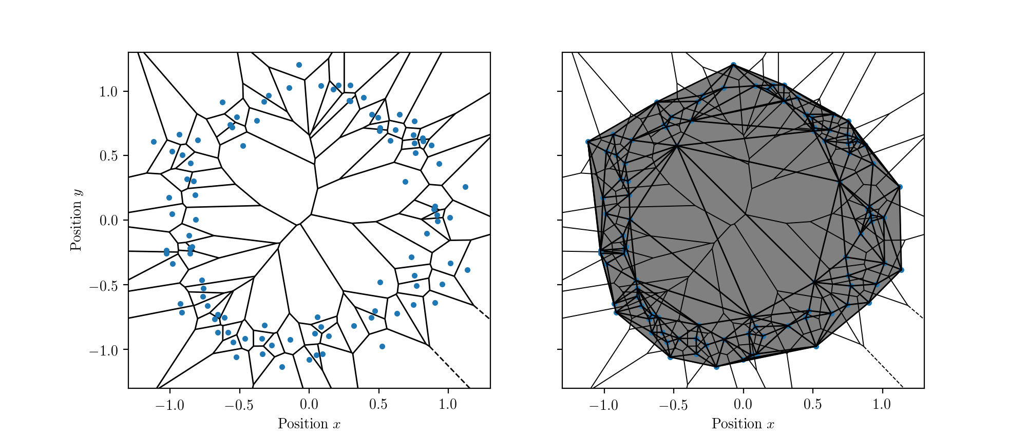 \textrm{Vor} (X) = \bigcup_{i=1}^n \big{y\in \mathbb{R}^d \, \big|\, ||y-x_i||\leq ||y-x_j|| \, \forall \, j\in {1,\dots,n}\big}. The Voronoi diagram consists of a Voronoi cell, polygonal in shape, around each of the data points x_i. Whenever the boundaries of two Voronoi cells intersect, an edge connecting the two corresponding data points x_i and x_j is added to the Delaunay complex. Whenever the boundaries of three Voronoi cells intersect, a respective triangle is added and so forth until the ambient space dimension d is reached. In the linked Figure the Voronoi diagram is displayed on the left-hand side, while on the right its dual, the Delaunay complex is shown.